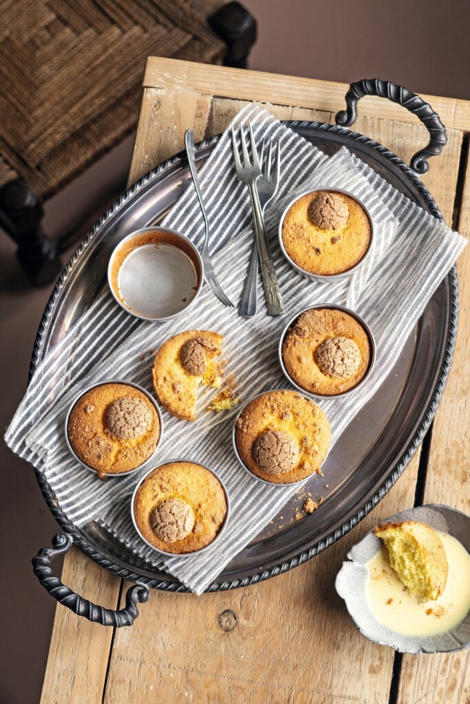 - Snijd 12 amaretti fijn en roer door het beslag. Verdeel het beslag over de vormpjes, verdeel de laatste amaretti-koekjes over het oppervlak en druk ze iets naar beneden. Bak de cakejes ± 15 min. zonder de deur te openen. Neem ze uit de oven en laat afkoelen. Neem ze uit de vorm en serveer met de custard.