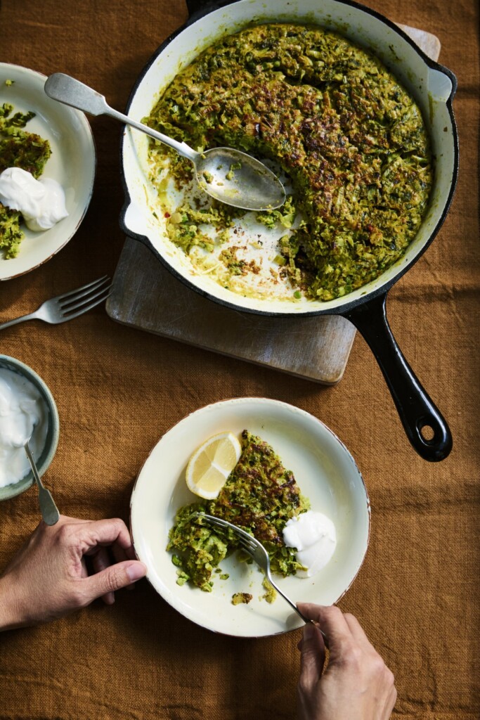 Frittata maar dan op z’n Palestijns! Sami Tamimi: ‘dit is een heerlijk dik, frittata-achtig mengsel van courgette, prei, doperwten, kruiden en eieren.’
