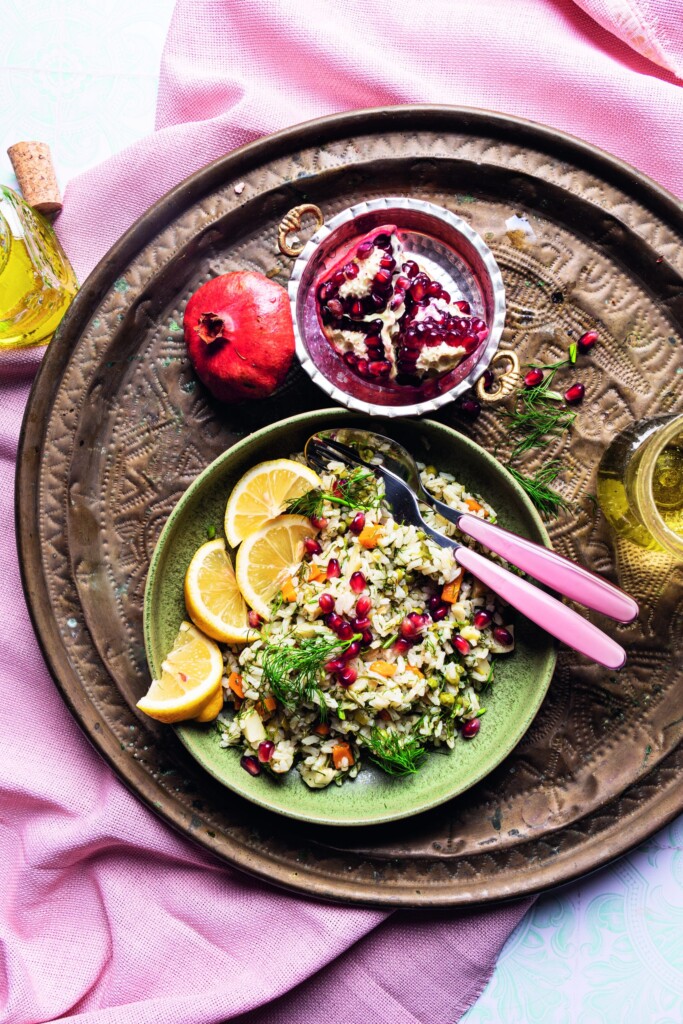 - Breng aan de kook, zet het vuur laag en laat de rijst 20 minuten pruttelen met het deksel op de pan. Snijd de dille fijn. Haal de pan rijst van het vuur en bestrooi met dille. Roer dit er samen met zout, peper en pul biber goed door en laat met het deksel op de pan 10 minuten rusten. Serveer met citroenpartjes en granaatappelpitjes als garnering.