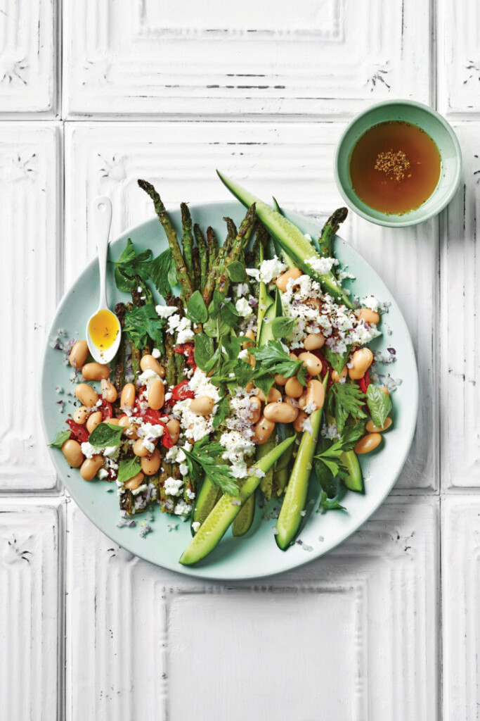 - Voeg de bonen, komkommer, kruiden, de helft van de rode ui, tomaatjes en feta toe aan de asperges. Voeg de helft van de vinaigrette toe en schep losjes door elkaar. Breng eventueel op smaak met peper en zout. Schep de salade op een schaal, bestrooi met de rest van de ui en tomaatjes en besprenkel met de rest van de vinaigrette. Strooi de rest van de feta erover.