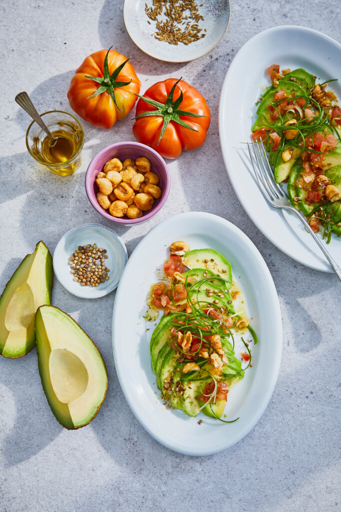 A salad a day… Ja, ja… keeps the doctor away. Maar de échte reden dat je deze salade het liefst als lunch én avondeten eet, is dat hij gewoon te lekker is. Romige avocado fris je op met een dressing van tomaatzaadjes en bestrooi je met knapperige maïs.
