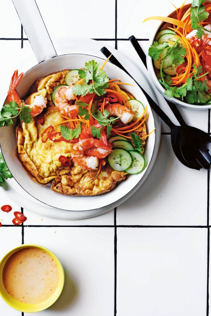 - Laat de omelet op een schaal glijden en schep de garnalensalade erover. Bestrooi met peperringetjes, munt en koriander en serveer.