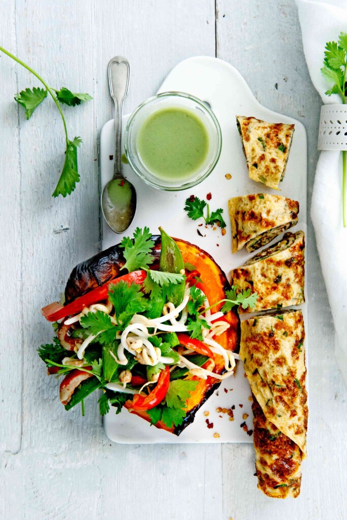 - Leg de geroosterde pompoen op 4 borden. Verdeel de gewokte groenten erover en besprenkel met de delicious.dressing. Bestrooi met de rest van de koriander. Garneer evt. met de chilivlokken of kort gebakken peperringen. Leg de omelet bij de lauwwarme salade.