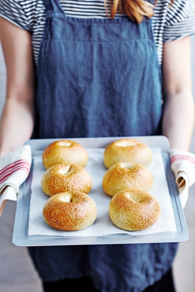 - STAP 8 Bak de bagels 8 min. in het midden van de oven, schakel dan de oventemperatuur terug naar 210°C en bak ze nog 8 min. tot ze goudbruin zijn. Neem de bakplaten uit de oven en neem de bagels met een theedoek van de bakplaat. Laat ze op een rooster afkoelen. Eet ze liefst binnen een paar uur.