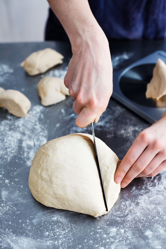 - STAP 3 (zie foto) Bekleed twee bakplaten met bakpapier en kwast licht in met olie. Verdeel het deeg in 12 stukken van ± 100 g.