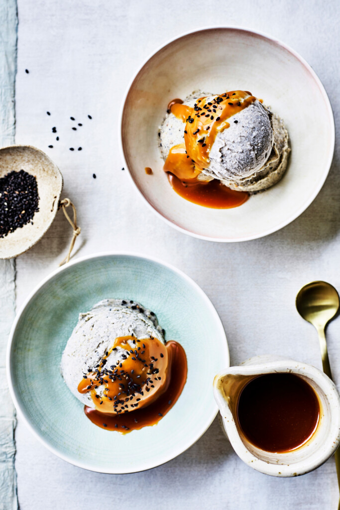 - Spuit het ijs in kommetjes of coupes, drizzle de sojasaus-karamel eroverheen, bestrooi met het achtergehouden sesamzaad en serveer.
