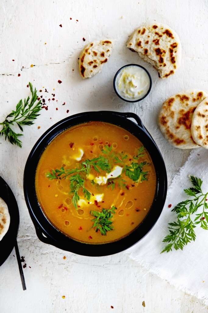 Honing, knoflook en chili zijn de smaakmakers in deze lentesoep met frisse gemberyoghurt & luchtige homemade minipita's.