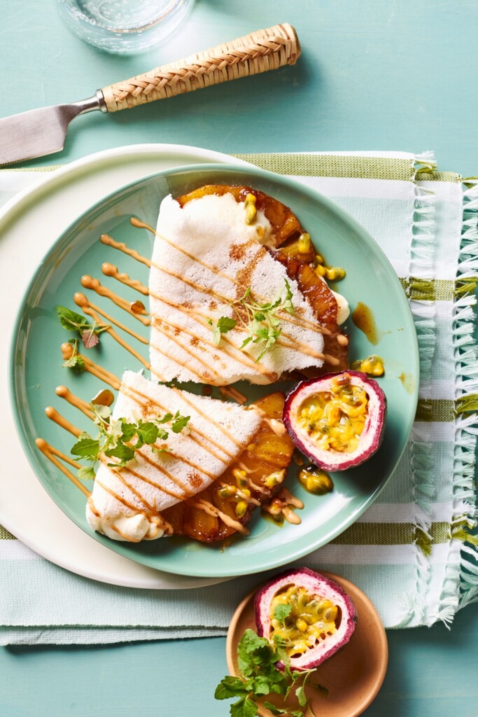 - Vul de pannenkoekjes met de ananas en vanilleroom. Besprenkel met karamelsaus. Garneer vlak voor serveren met citroenmelisse en serveer eventueel met passiefruit.