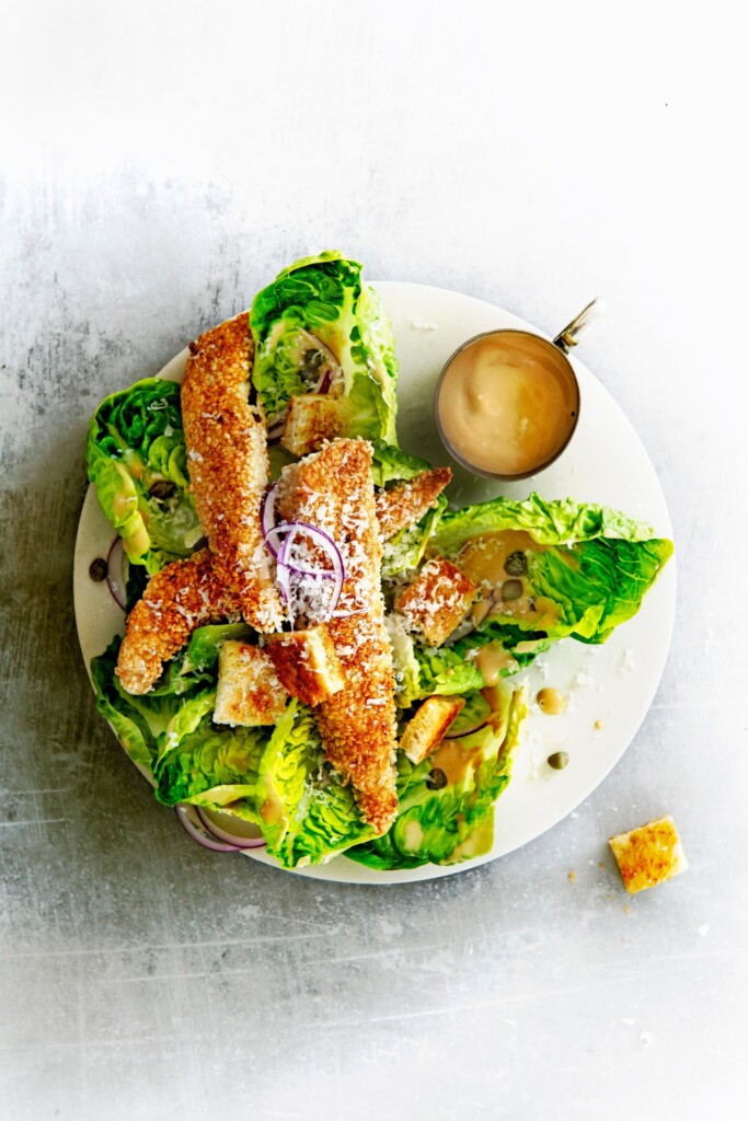 - Snijd de ui in halve ringen. Verdeel de slablaadjes met de sesamkip en uiringen over vier borden. Besprenkel de salade met de dressing en bestrooi met kappertjes en croutons. Schaaf of rasp de kaas over de salade.