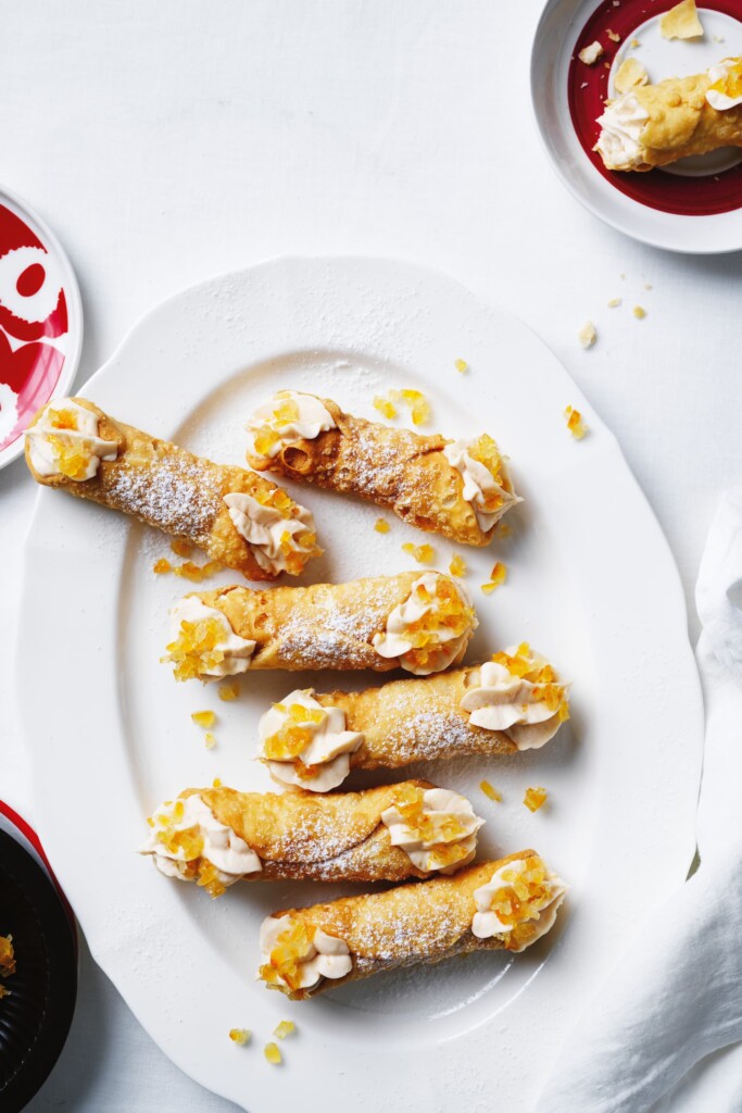 *Kant-en-klare cannoli-rolletjes koop je bij Italiaanse delicatessenwinkels of online. Of maak ze zelf (ga naar deliciousmagazine.nl/cannoli-witte-chocolade). Oranjesnippers zijn stukjes gekonfijte sinaasappelschil. Te koop bij de notenkraam en online.