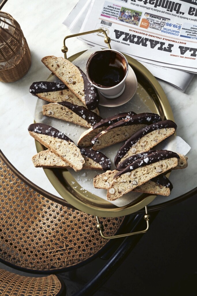 Maak deeg met geroosterde hazelnoten. Bak knapperig en doop dan in pure chocolade en bestrooi met zeezout, è tutto.