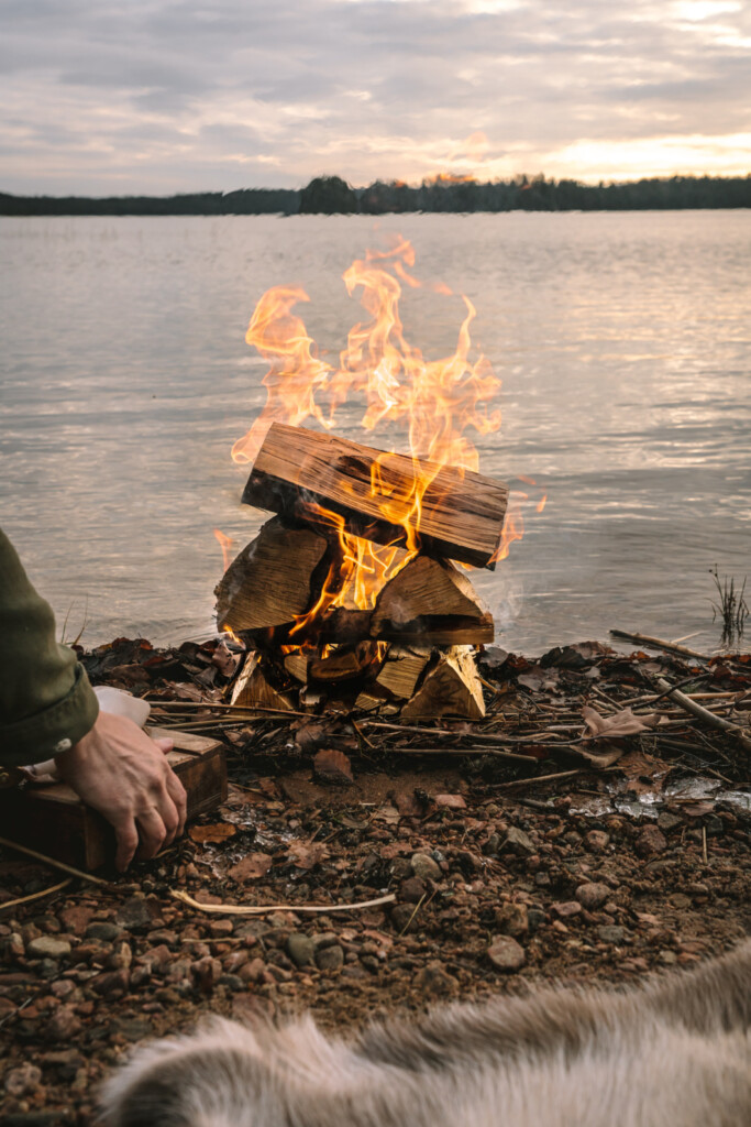 Een log cabin fire (houtblokken in de vorm van een blokhut gestapeld) is perfect voor beginners; stabiel, betrouwbaar en onderhoudsarm. Wil je snel iets grillen? Ga voor een lean-to fire (kleine takjes leunen schuin tegen een dikke stam). Voor langzaam garen kies je een rakovalkea (een Fins vuur met twee forse boomstammen) of star fire (meerdere stammen in stervorm). Een hunter’s fire (gestapeld hout en takken) is ideaal als je pannen en roosters wilt gebruiken.