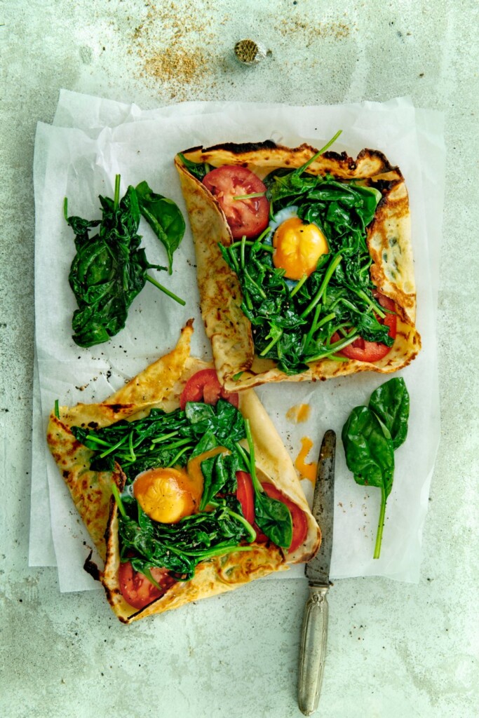 Vandaag doen we een vega-dag met deze heerlijke spinazie- tomaatcrêpe met een eitje erop. Een gerecht met Franse roots! Altijd fijn, met zo weinig ingrediënten zoiets lekkers maken. Binnen het halfuur klaar, dus ideaal voor een doordeweekse dag. En ook nog met een royale portie spinazie, dus met de groenten zit je goed. Bestrooi de flensjes als ze uit de oven komen met extra nootmuskaat.