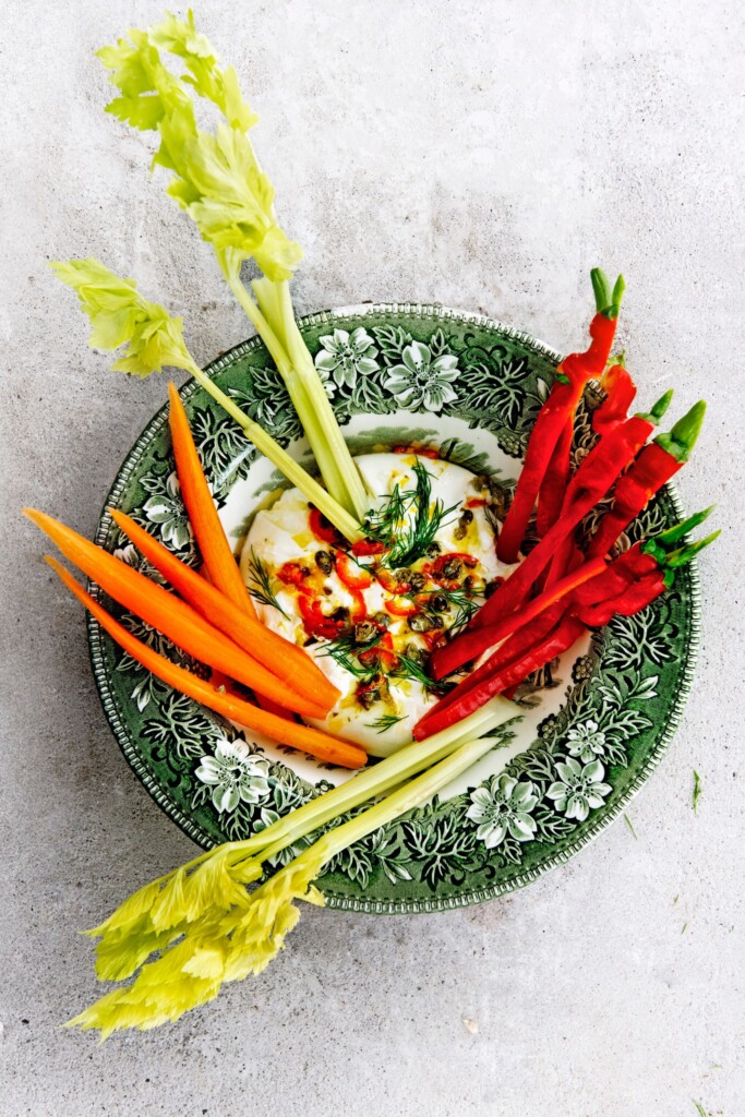 Mediterraan etentje op de planning? Ga van start met rauwkost en een lekkere dip. Het romige hart van burrata is ideaal om in te dippen: olijfolie, kappertjes, citroen en kruiden. Tip: Ook cherrytomaatjes, reepjes venkel en roosjes bloemkool zijn lekker als rauwkost erbij. En heb je geen burrata? Vervang deze dan door buffelmozzarella. Schep op de opengesneden buffelmozzarella een lepel crème fraîche.