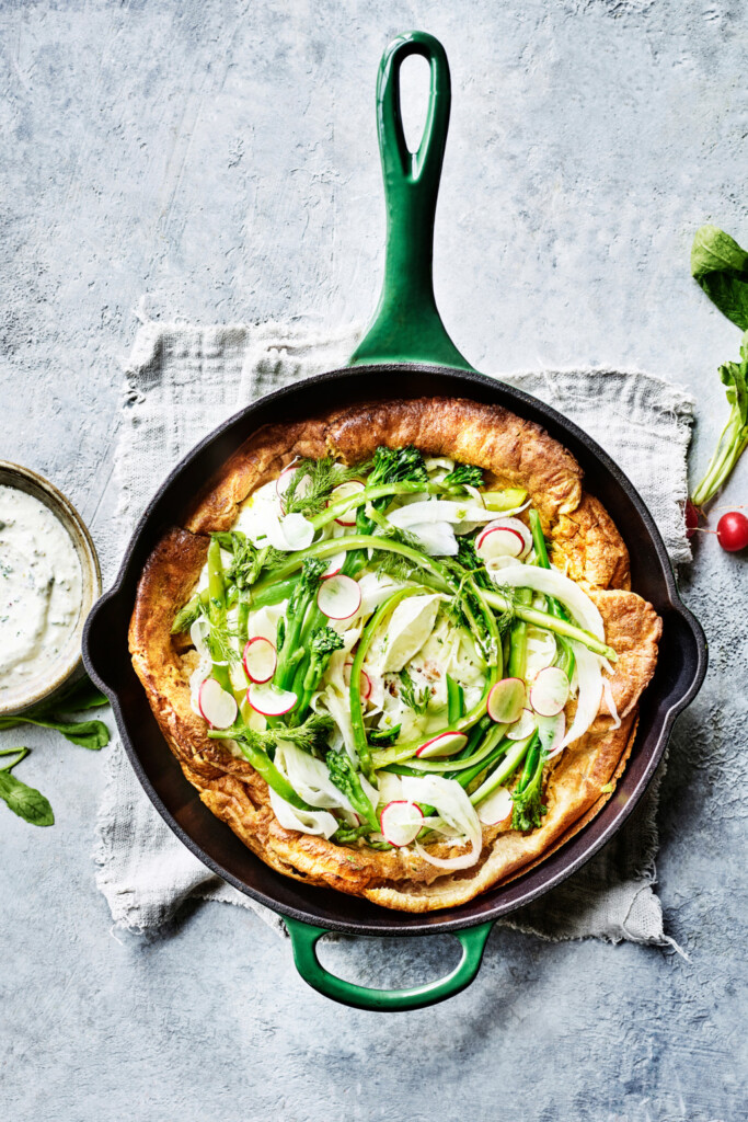 - Bestrijk de Dutch baby’s royaal met de hangop. Schep de bimi en asperges om met de venkel en radijs en breng op smaak met peper en zout. Verdeel de salade over de Dutch baby’s en bestrooi met de rest van de peterselie. Serveer direct. Lekker met extra vergine olijfolie om te besprenkelen.