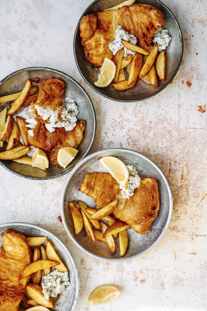 - Schep de aardappelpartjes op een bord en serveer samen met de krokante vis, remoulade en een partje citroen.