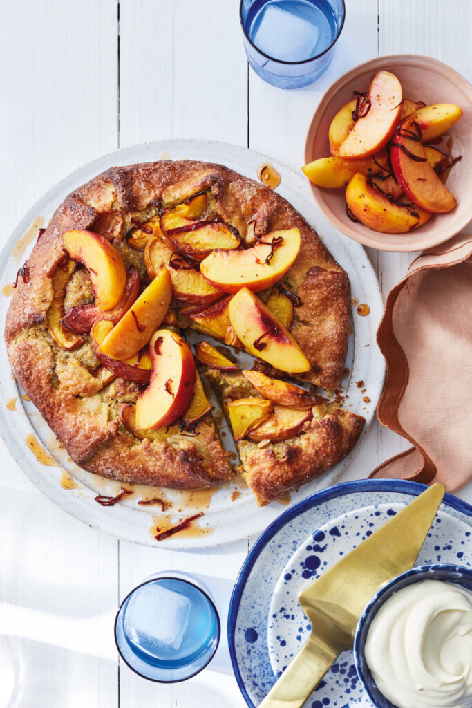 - Serveer de galette warm, koud of op kamertemperatuur met extra perzikpartjes, de resterende siroop en opgeklopte crème fraîche.