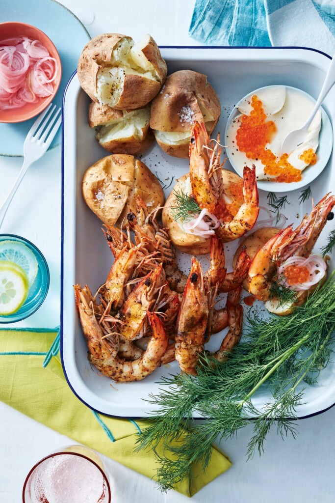 Gepofte aardappels – in de zomer het liefst van de barbecue – kun je ook prima als voorgerecht serveren. Geef er deze te lekkere garnalen bij en smeer je aardappel in met een lik zure room, frisse sjalotten en zalmkuit.