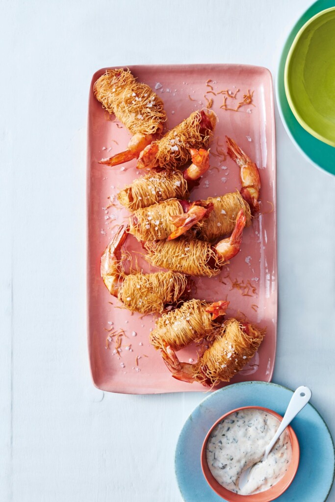 Misschien ken je het Griekse 'kataifi' ook wel als engelenhaar: tijdens het bakken worden de dunne draadjes in rap tempo ontzettend knapperig. Doe daar je voordeel mee, en wikkel ze om garnalen en ham voor een verrassend hapje. Dit recept is voor 12 stuks.