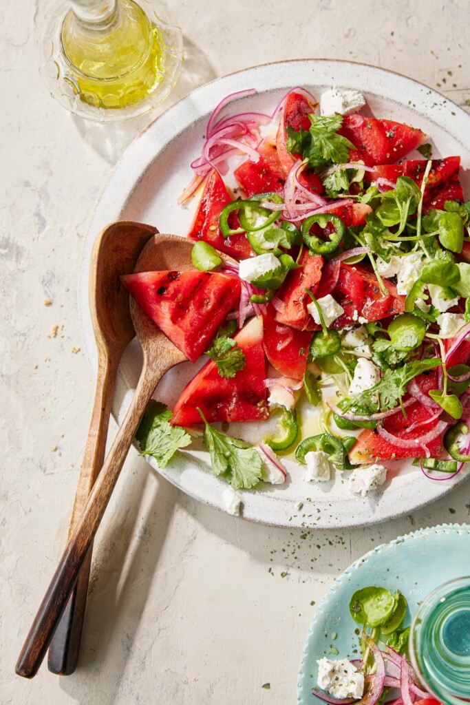 Niet je standaard watermeloensalade! Door de parten watermeloen eerst te grillen in de pan of op de bbq, en te marineren met limoen en jalapeño is de smaak en textuur net even wat spannender.