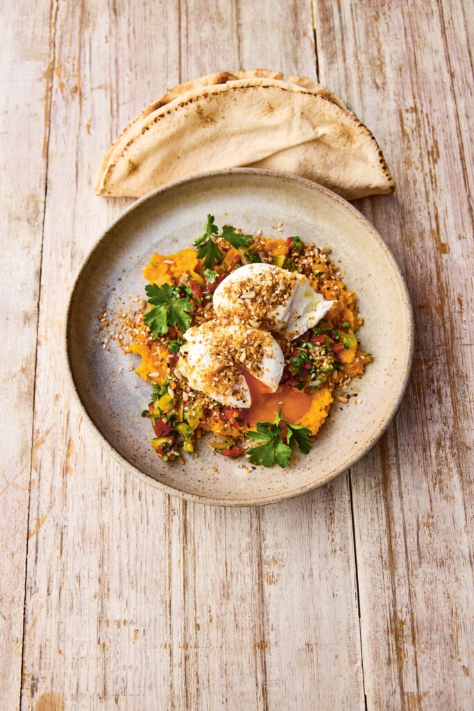 - Prak ondertussen de gare zoete aardappel met 2 theelepels extra vierge olijfolie, gooi de schil weg en breng op smaak met peper en zout. Schep de puree op een bord, leg de aangemaakte tomaatjes in het midden en leg de gepocheerde eieren er met een schuimspaan op. Bestrooi met de dukkah, de apart gehouden peterselie en eventueel nog een scheutje extra vierge olijfolie. Lekker met flatbread.
