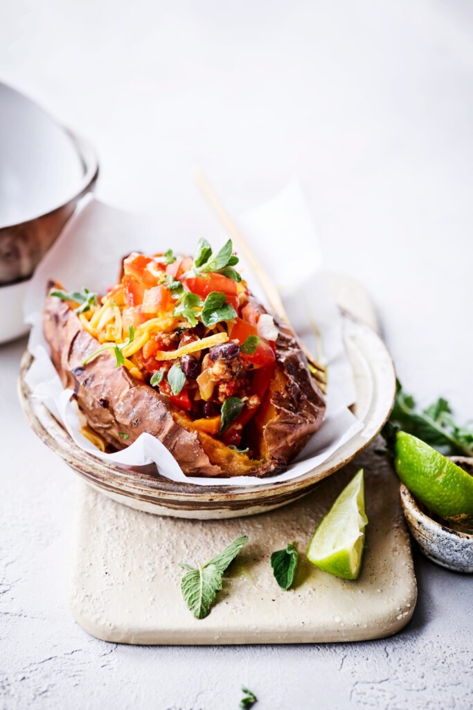 - Neem de aardappels uit de oven en snijd ze bijna helemaal in de lengte door. Verdeel er wat chilimengsel over en bestrooi met kaas. Schep er salsa op en bestrooi met extra oregano. Geef de extra limoen erbij en eventueel wat extra chili.