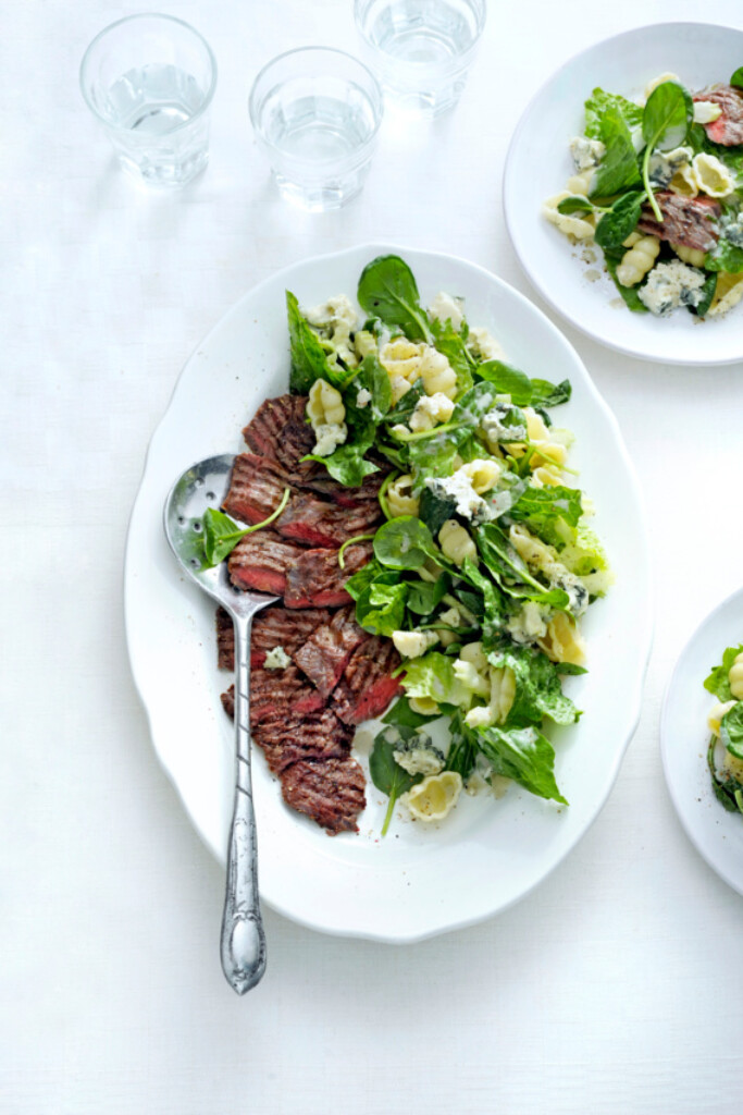 Deze geroosterde bavette kan zowel op de barbecue als op de grillpan worden bereid. Samen met de pastasalade met blauwe-kaasdressing, is dit hét gerecht voor een heerlijke zomeravond.