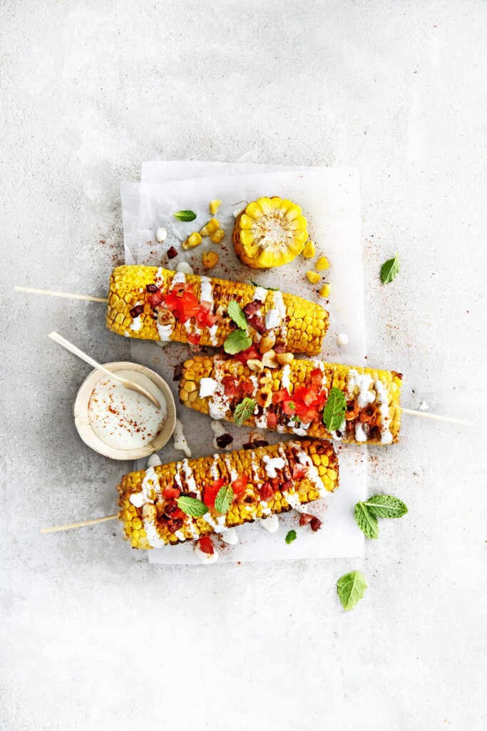 - Leg de maïskolven op 4 borden. Top ze met wat limoenyoghurt, de pancettablokjes, de tomaat en de geitenkaas. Bestrooi met de hazelnoten, de munt en chiliflakes naar smaak.