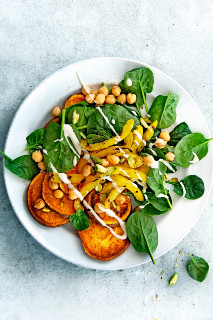 - Leg de geroosterde zoete aardappel op 4 borden. Verdeel de spinazie, gegrilde paprika en kikkererwten erover.