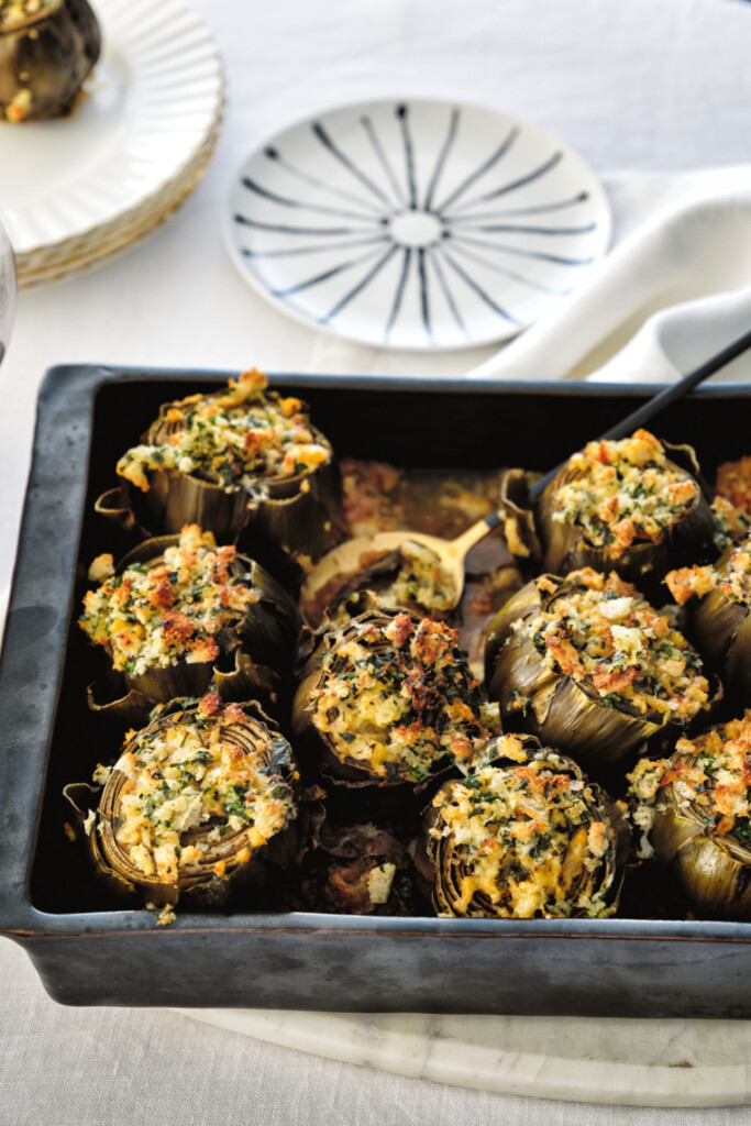 Een knapperige buitenkant tegenover een rijke, zachte binnenkant, deze gevulde artisjokken zijn on-weer-staan-baar!Tip! Je kunt de artisjokken tot en met stap 3 vooruitmaken en in de koelkast bewaren. Maak het gerecht op de dag zelf af in de oven zodat de topping lekker knapperig blijft.