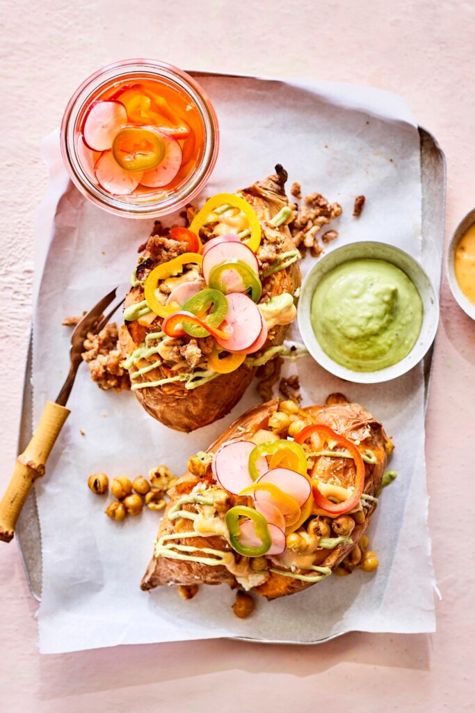 - Leg de zoete aardappels op een schaal en vul de helft van de aardappels met gehakt en de andere helft met kikkererwten. besprenkel met de avocadoroom, chipotlemayo en maak af met de ingelegde radijs en paprika.