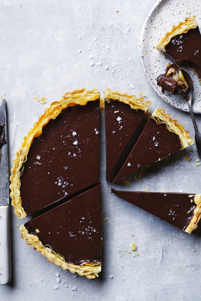 Deze chocotaart is zo simpel en snel te maken: een knapperige bodem, zijdezachte vulling en zoutvlokjes als finishing touch.