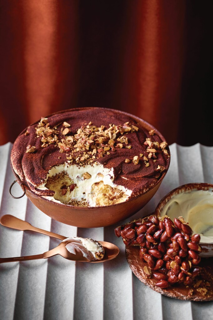- Bestuif de tiramisu vlak voor serveren met cacaopoeder en strooi nog wat karamelamandelen erover.