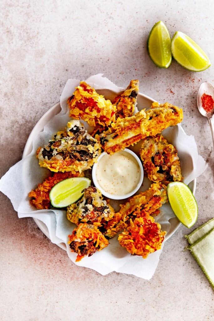 Superkrokante groenten in een beslag met tortillachips zijn een perfecte start voor een tex-mex weekendmenu.