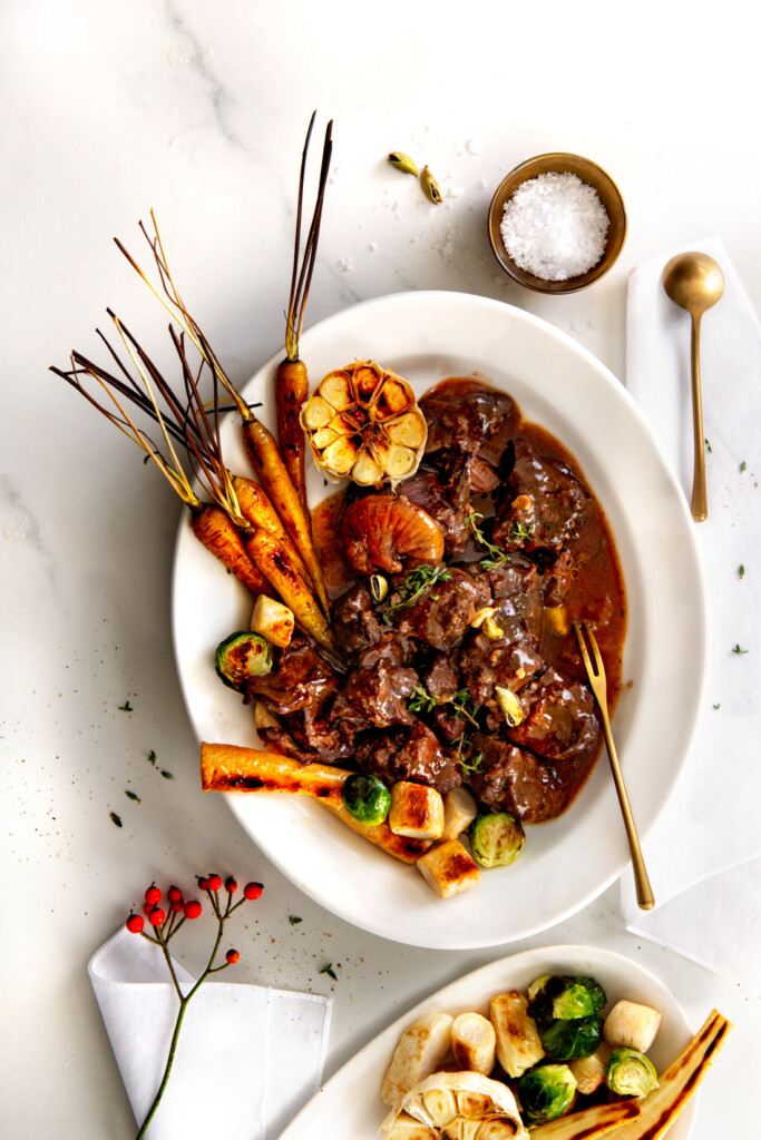 - Schep het stoofvlees met de saus op een schaal. Serveer met de geroosterde groenten.