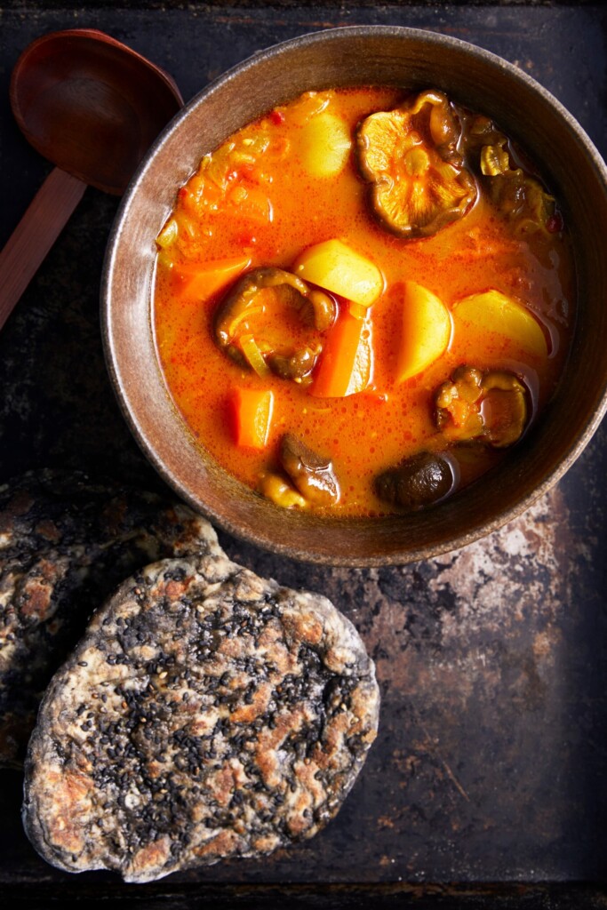 Als je een blikje S&B curry powder hebt meegenomen uit Japan gebruik dat dan in plaats van Madras-kerriepoeder voor een nog authentiekere Japanse curry. Deze aardappel-paddenstoelenstoof is heerlijk zoet dankzij de chutney en appel, met genoeg hartigheid van de paddenstoelen. Tip: Lekker met zwart misoflatbread met sesam van pagina 369 uit Slowcookerbijbel.