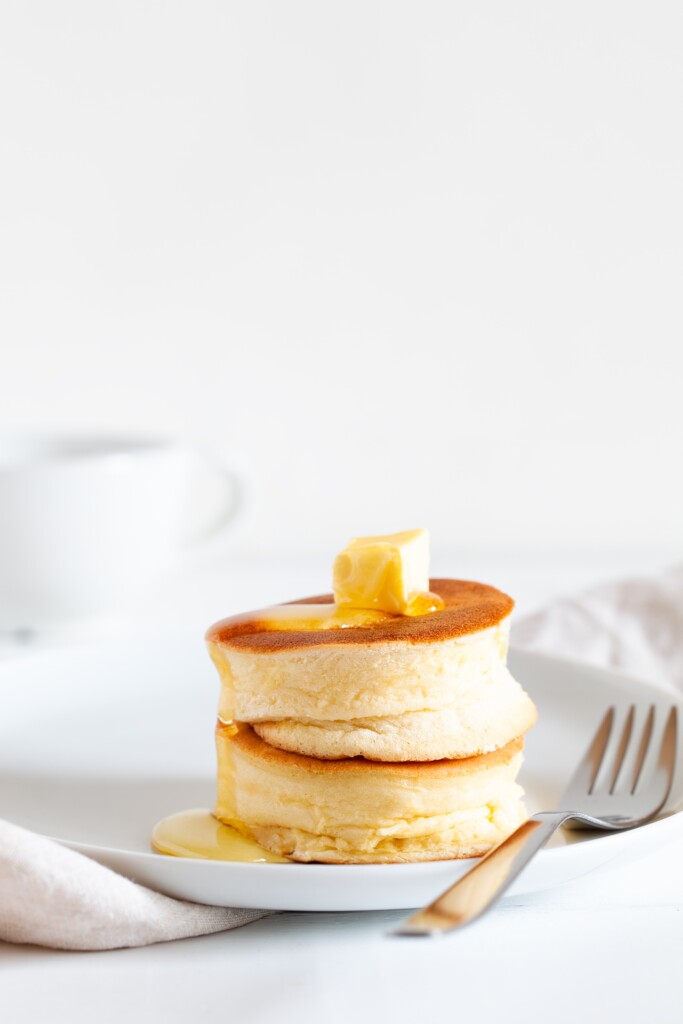 Soufflé pannenkoekjes: een kruising tussen een pannenkoek en soufflé. Het geheim? Meng flink wat geklopte eiwitten door je pannenkoekbeslag, zo worden ze lekker dik en súper fluffy.