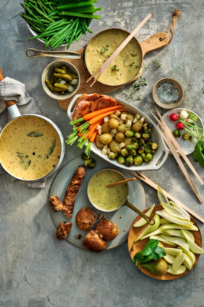 - Doe de fondue in een fonduepan en serveer de krieltjes, knolselderij, augurkjes, spruitjes, uitgebakken bacon en de rauwe groente er apart bij.