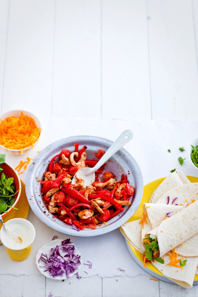 - Schep de kip in een schaal en zet met de wraps op tafel. Laat iedereen zelf zijn wrap maken: beleg de wrap met waterkers en schep er een beetje kip op. Top af met de zure room, de ui en de kaas en rol de fajita’s op.