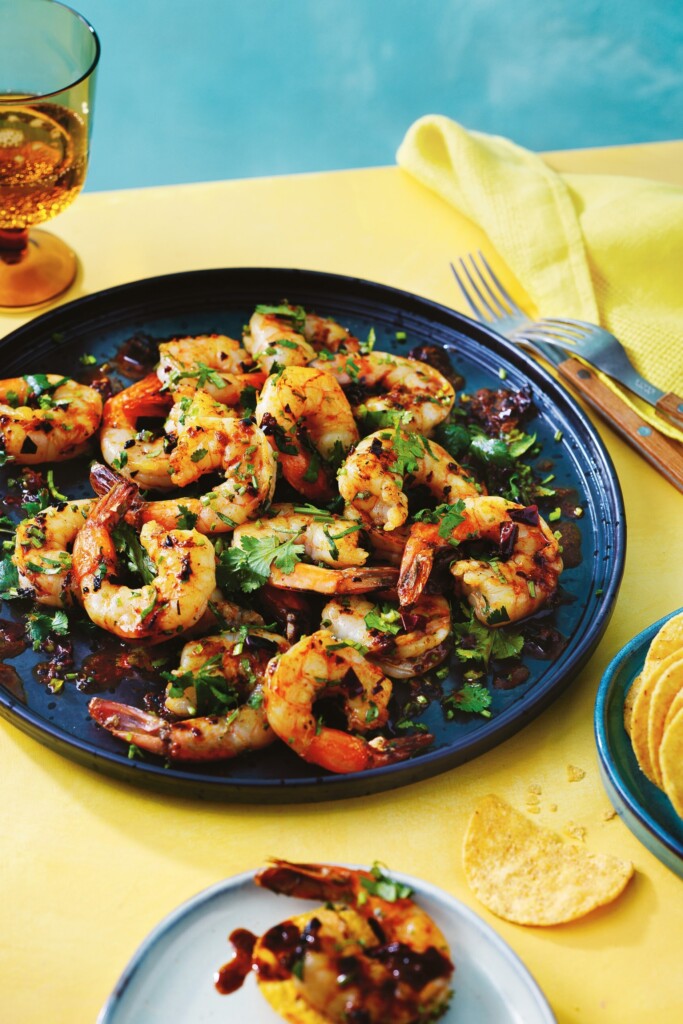 - Voeg de helft van het limoensap toe en meng goed door. Verhoog de temperatuur naar middelhoog. Voeg de garnalen toe en bak, af en toe roerend, ± 3 min. totdat ze roze en ondoorzichtig zijn.