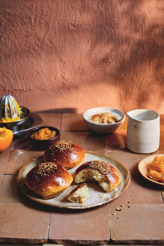 - Meng het deeg in een keukenmachine met deeghaak of met de hand. Doe de tarwebloem, suiker, het zout, sesamzaad en gemalen anijszaad in een mengkom of de kom van een keukenmachine en meng. Voeg de eieren, zonnebloemolie en het oranjebloesemwater toe. Laat de gist in de lauwwarme melk oplossen en schenk dit papje in de kom. Kneed alles tot een glad en samenhangend, maar niet plakkerig deeg. Voeg de zachte boter beetje bij beetje toe en blijf kneden tot het deeg van de wand van de kom loskomt.