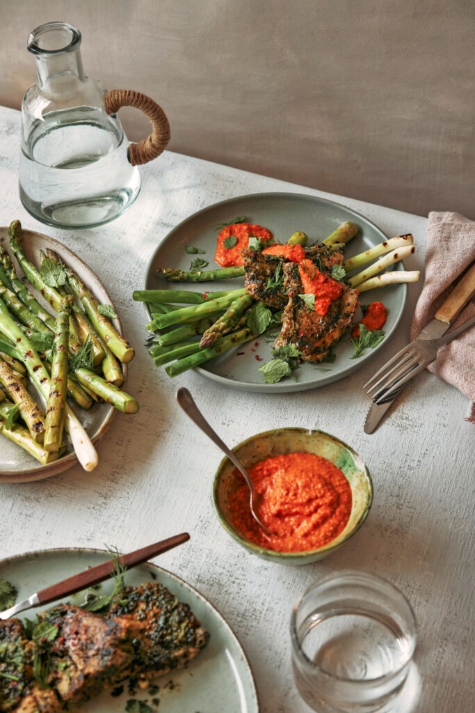 - Verhit een grillpan voor op hoog vuur. Besprenkel de lente-ui en de groene asperges rondom met de rest van de olijfolie. Gril in delen totdat aan beide zijden grillstreepjes verschijnen. Serveer de lamskoteletten met de gegrilde groenten en romescosaus.