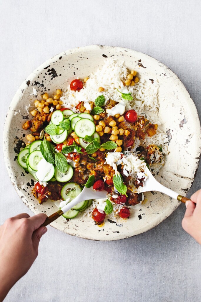 - Schep de rijst in een grote schaal en schep hierop de kasundi en de komkommerschijfjes. Sprenkel er wat yoghurtdressing over, strooi er munt over en schep om.