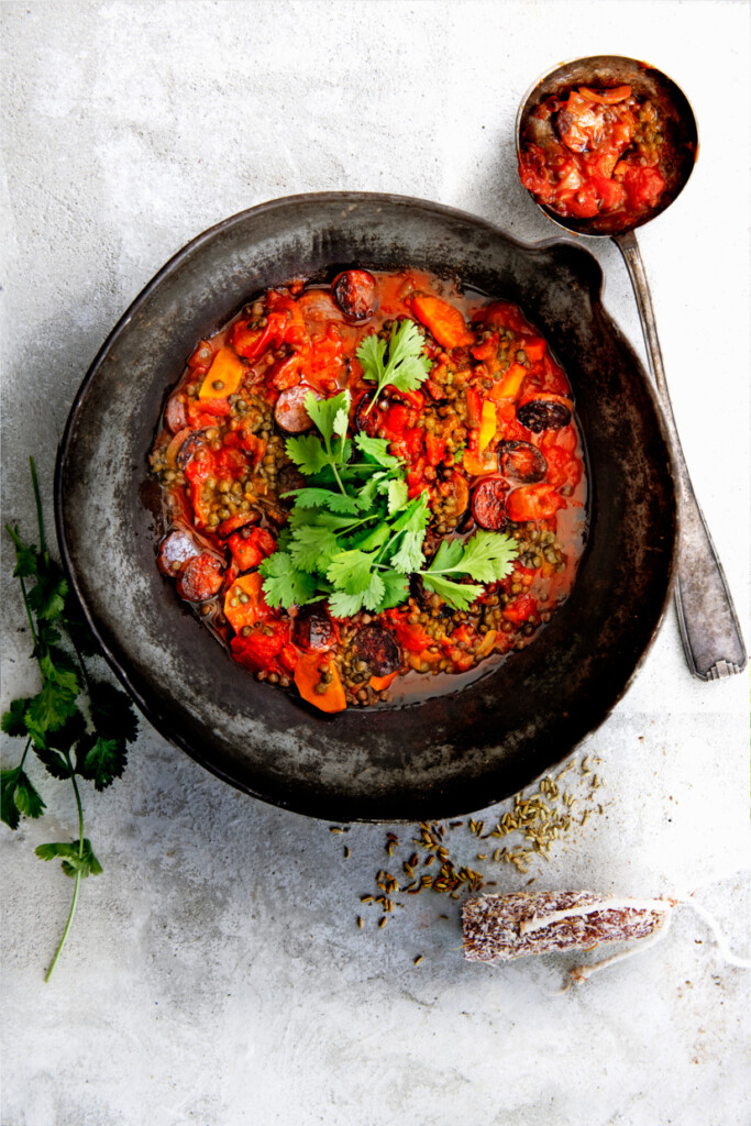 - Voeg de linzen toe en warm 3-4 min. mee. Breng de linzenstoof op smaak met zout en peper. Schep op 4 borden en bestrooi met de koriander. Geef er stokbrood bij.