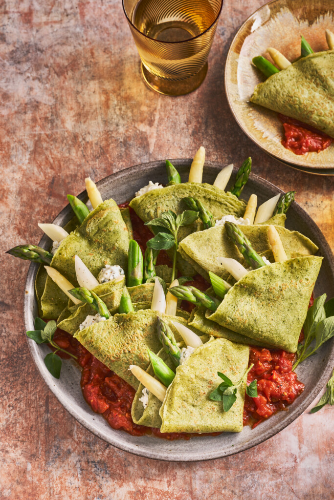 Kruidige, groene flensjes die je vult met romige stracciatella en frisse asperges. De lichtpittige arrabbiatasaus brengt dit gerecht tot leven.
