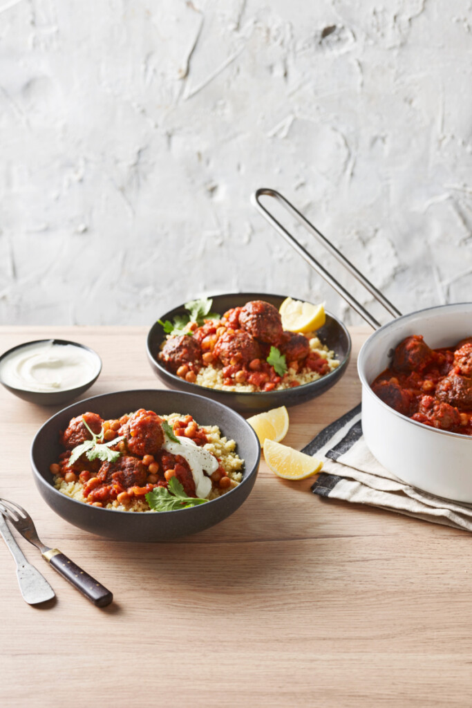 Warme Marokkaanse gehaktballetjes in een rijke tomatensaus met kikkererwten: daarvoor mag je me altijd wakker maken. De frisse yoghurt vormt een heerlijk contrast met de kruidige, verwarmende smaken van het gerecht.