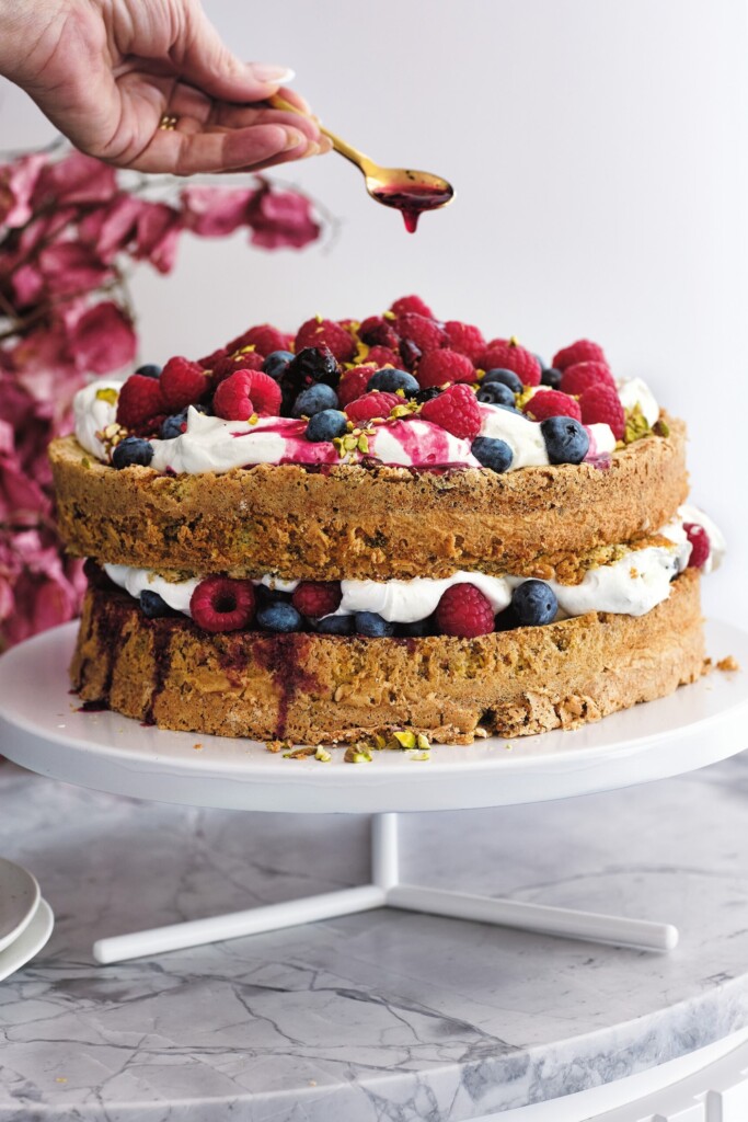 6. Plaats de tweede taartbodem erop. Bestrijk met de rest van de mascarponeroom en de rest van de bessen en bestrooi met de extra gehakte pistachenoten. Druppel er een beetje bessensaus over en serveer met de resterende saus ernaast.