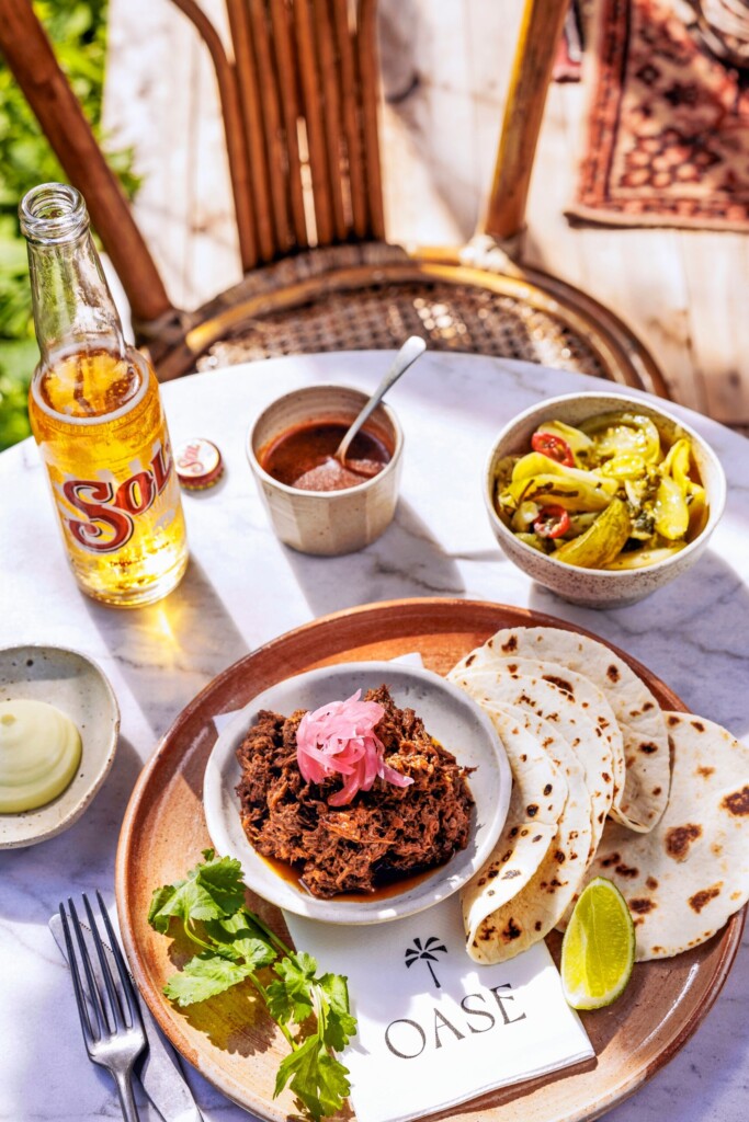 - Serveer het stoofvlees met de mango-habanerosalsa, avocadoroom, bloemtortilla’s en de saus.