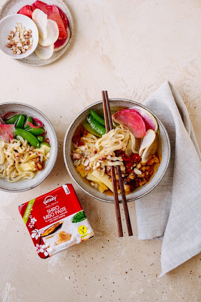 - Schep 1 el shiro miso pasta op de bodem van de kommen. Verdeel de noedels, het krokante gehakt, de sugarsnaps, bamboescheuten en plakjes watermeloenradijs over de kommen. Giet de bouillon in de kommen en garneer met de krokante pinda’s.