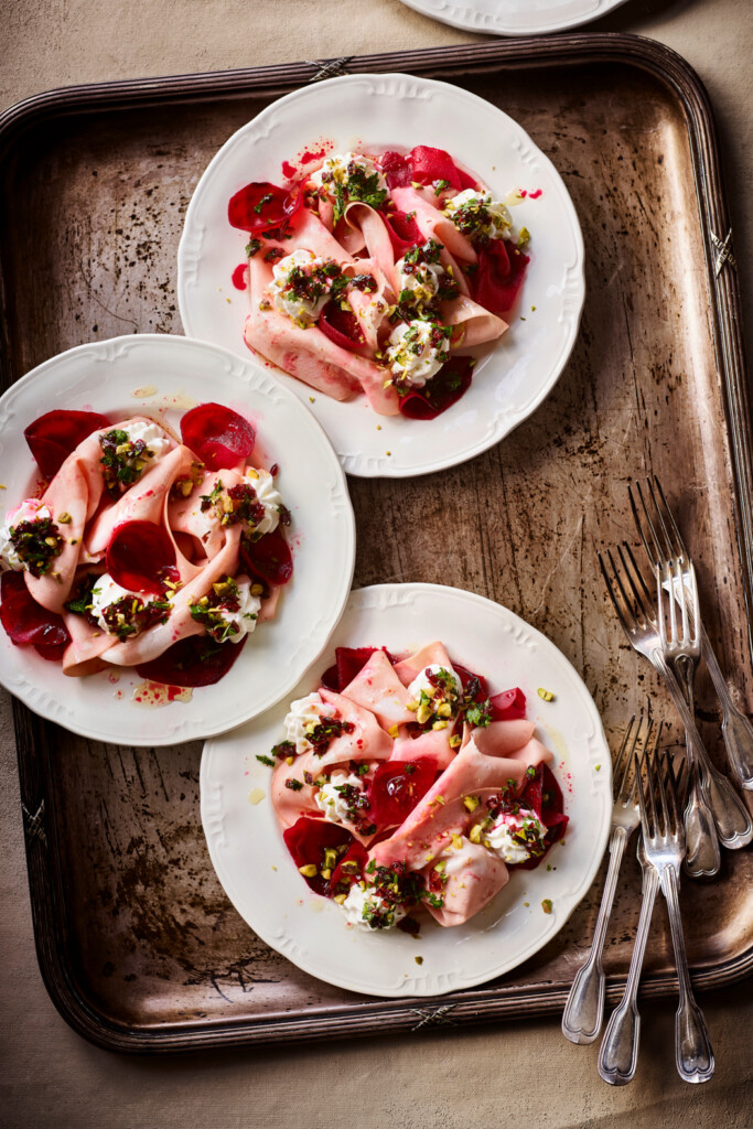 - Drapeer de mortadella over 8 borden en verdeel de plakjes gemarineerde biet erover. Schep er dotjes luchtige ricotta en cranberry-gremolata op. Bestrooi met de pistache en besprenkel met extra olijfolie. Laat wat druppeltjes bietenvocht in de olijfolie vallen voor een extra feestelijk effect. Serveer direct.